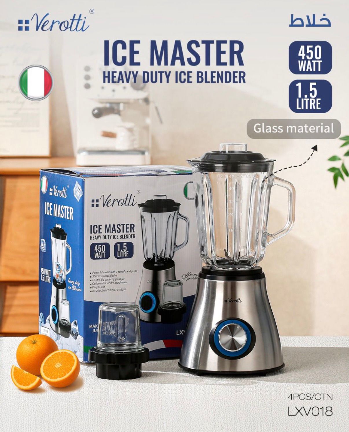 خلاط فيروتي ستانلس قوي وعصري، يخلط العصائر والمخفوقات بسرعة وسلاسة، مع شفرات متينة تمنحك نتائج ناعمة في كل مرة. مثالي لكل مطبخ عملي وأنيق.
