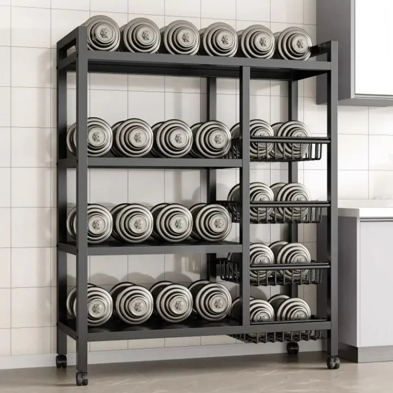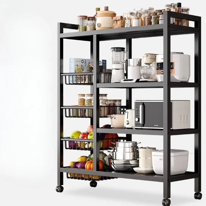 مزود بعجلات لتسهيل الحركة والتنقل، مع سلال جانبية توفر مساحة إضافية لتخزين الخضار، البهارات، أو الأدوات الصغيرة.