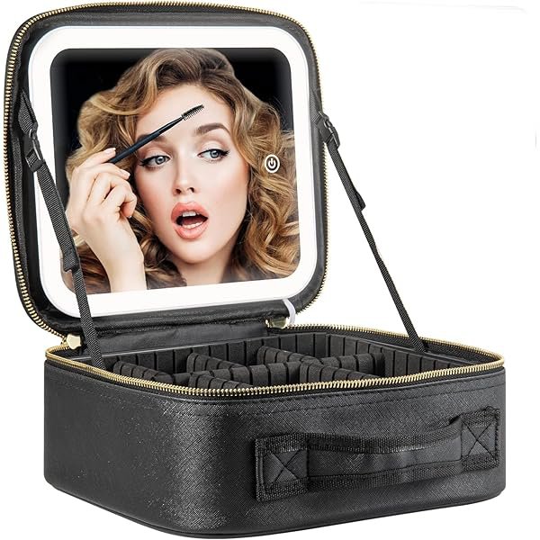 حقيبة مكياج أنيقة مزودة بمرآة كبيرة بإضاءة LED قابلة للتعديل، مثالية لتطبيق المكياج بدقة في أي مكان.