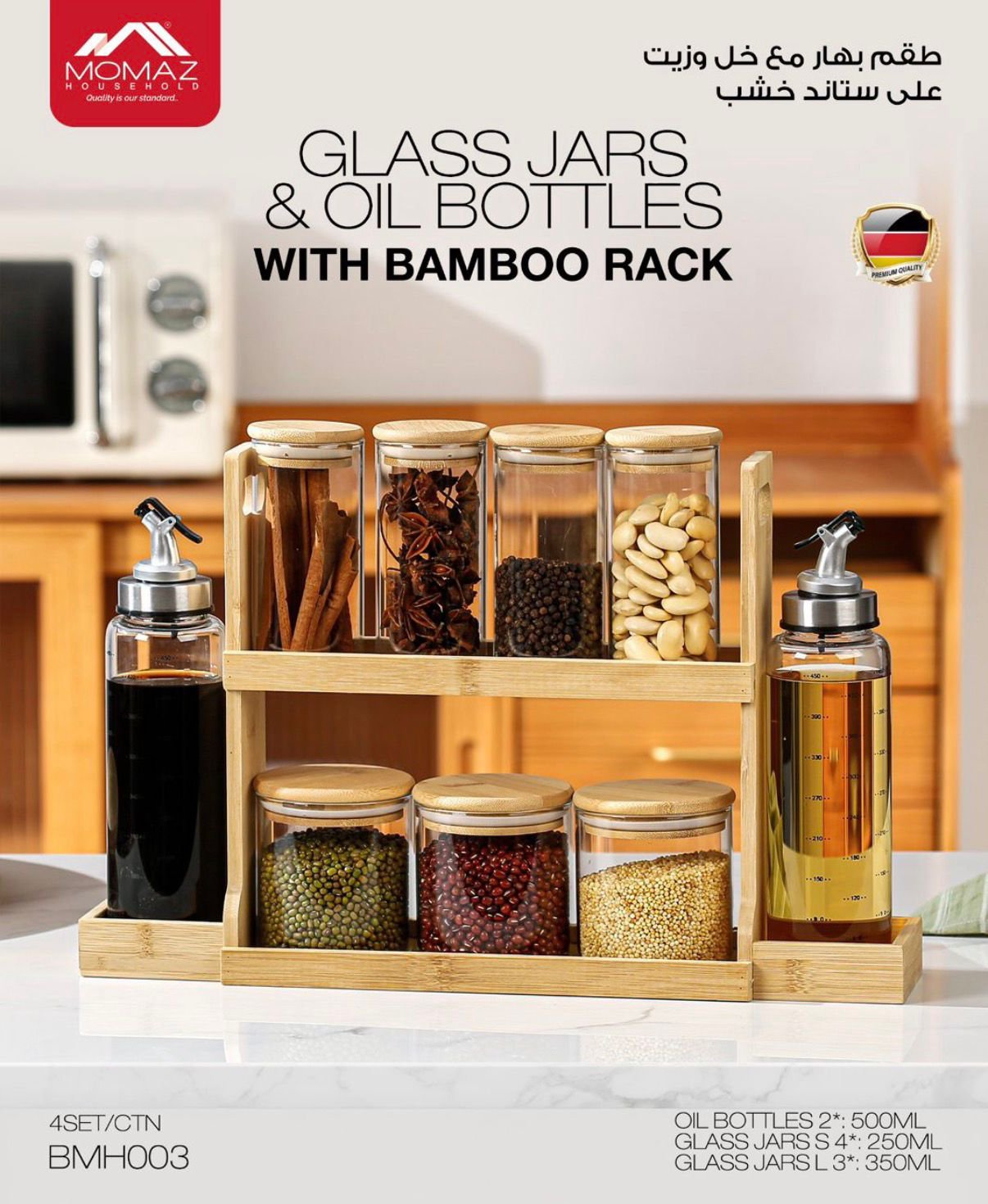 طقم بهارات مع خل و زيت بامبو Glass jars oil bottles BMH003