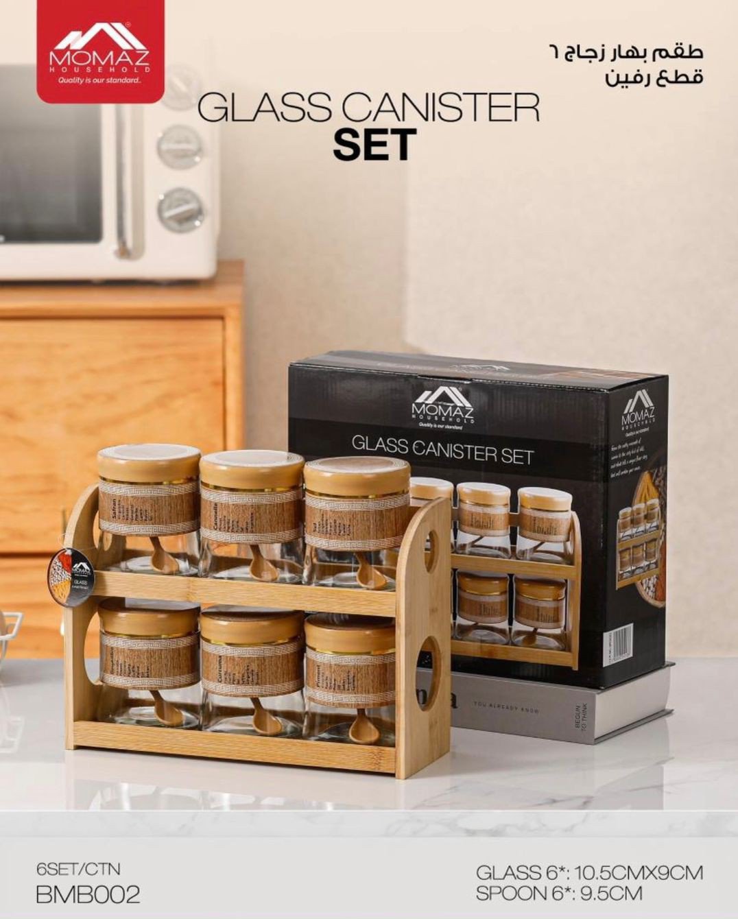 طقم بهارات زجاجي من MOMAZ مكوّن من 6 مرطبانات مع رف خشبي راقي من طابقين، تصميم عملي ومرتب يضيف لمسة جمال وتنظيم للمطبخ.