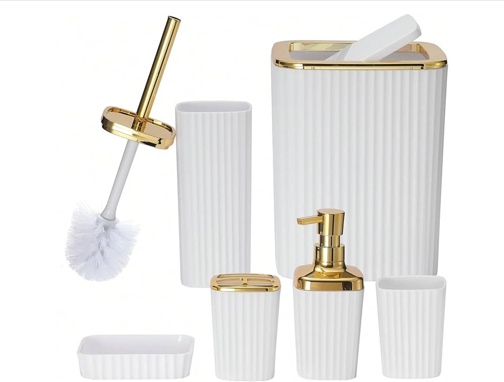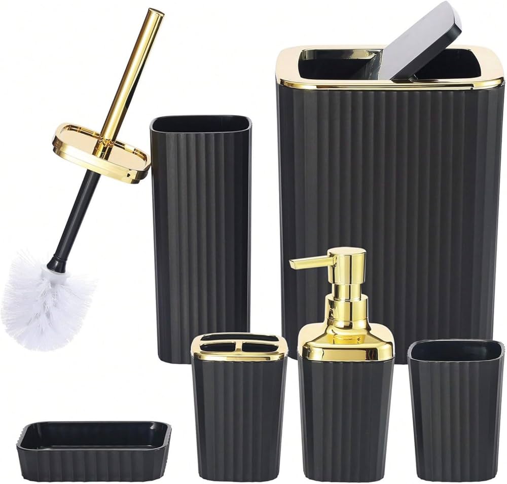 طقم إكسسوارات حمّام أنيق بتصميم فاخر يجمع بين اللون الأسود المطفي ولمسات ذهبية راقية ✨