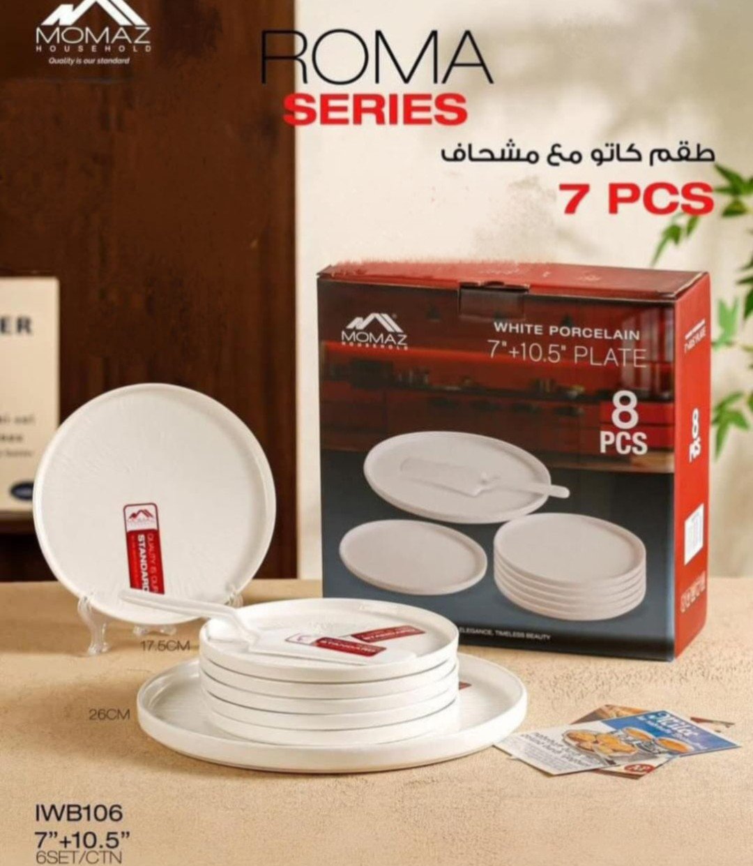 يأتي الطقم مع مشحاف تقديم بنفس التصميم ليضيف لمسة فاخرة على سفرتك، مناسب للكيك، التارت، المعجنات والحلويات اليومية.
