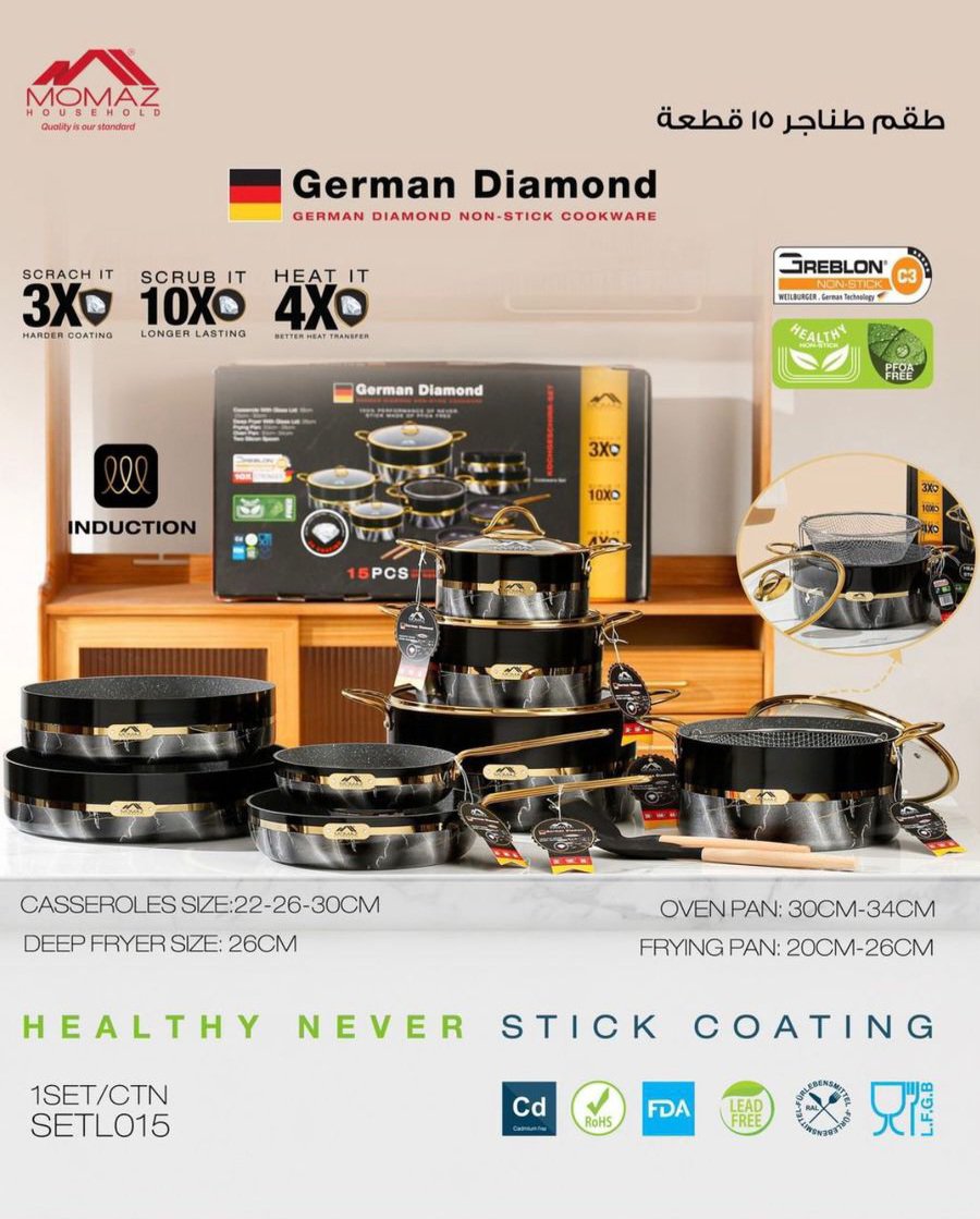 طقم طناجر ألماني فاخر من ماركة German Diamond مكوّن من 15 قطعة. يتميز بطلاء غير لاصق عالي الجودة من Treblon المقاوم للخدش والحرارة، ما يضمن طبخًا صحيًا بدون التصاق.