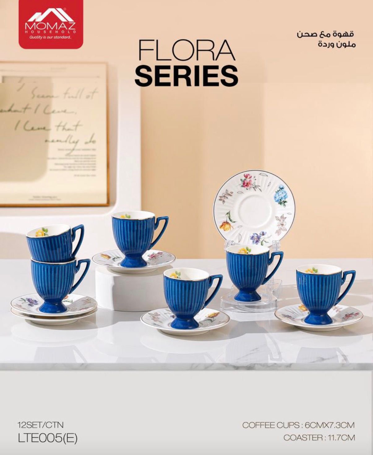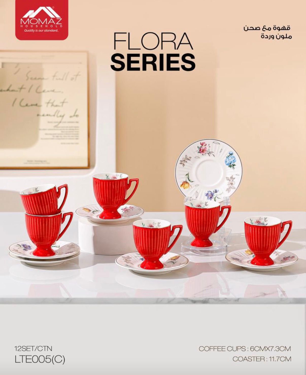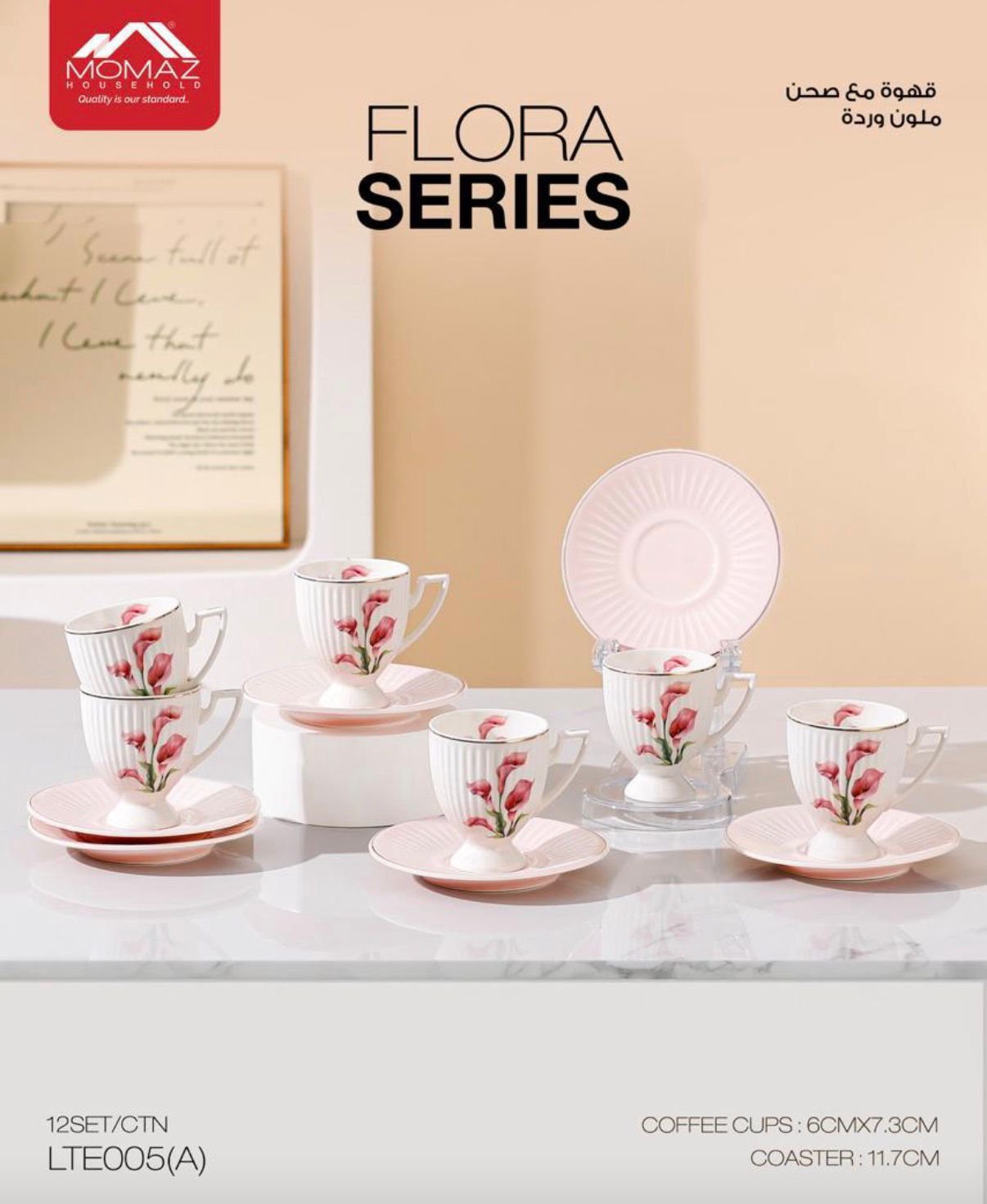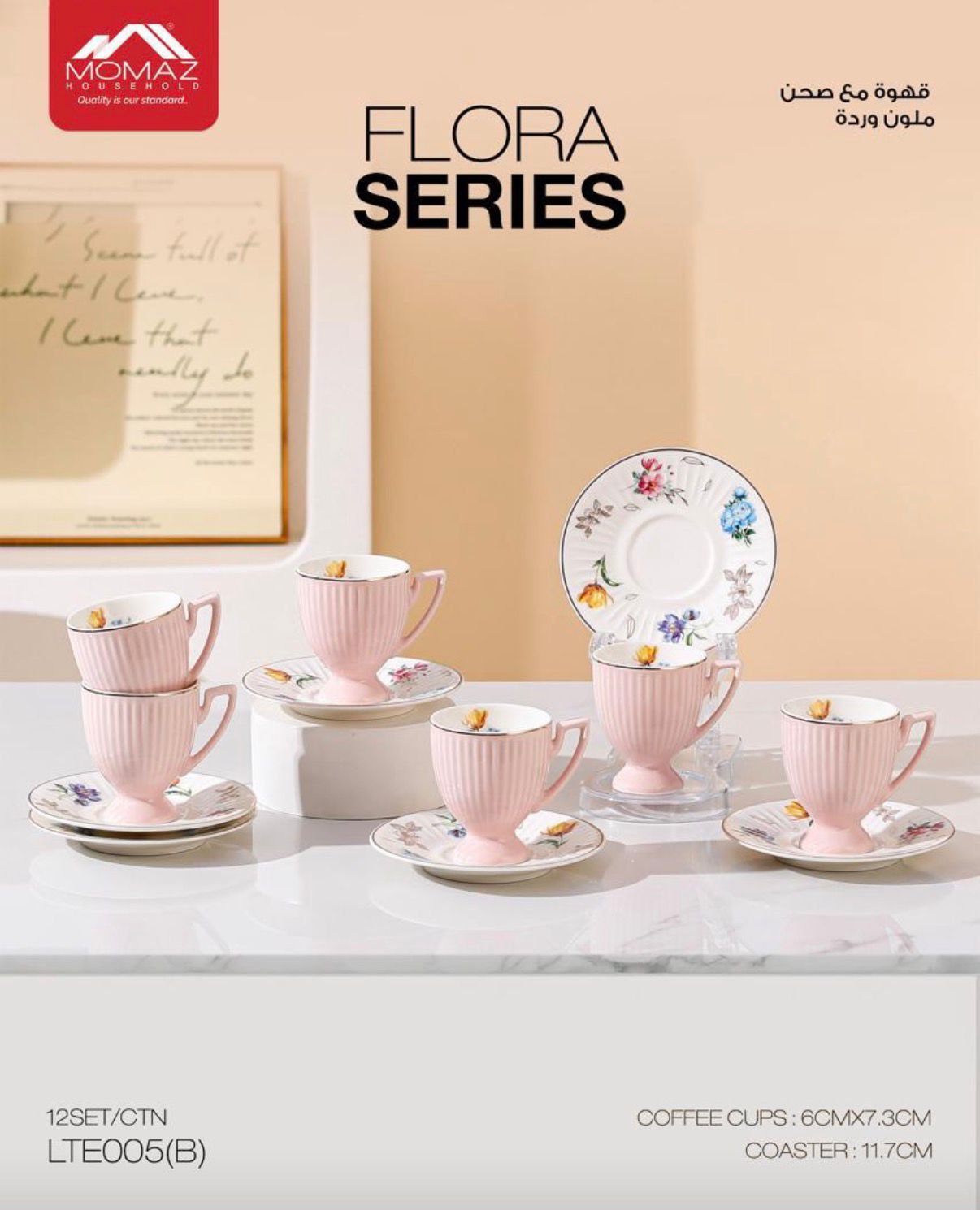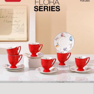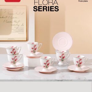طقم فنجين قهوة مع صحن موديل Flora Series تصميم أنيق بنقش ورد ناعم، متوفر بعدّة ألوان. خامة عالية الجودة مناسبة للاستخدام اليومي والضيافة.