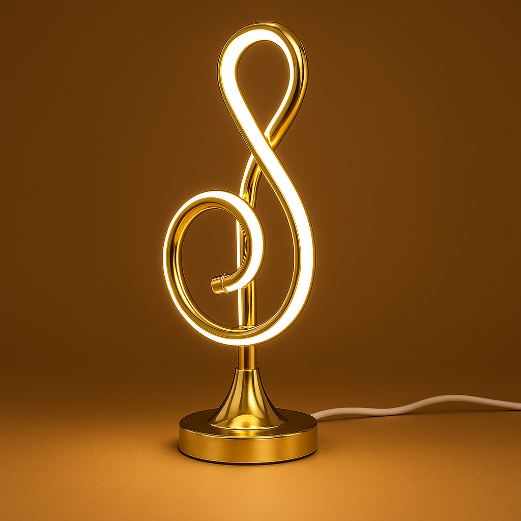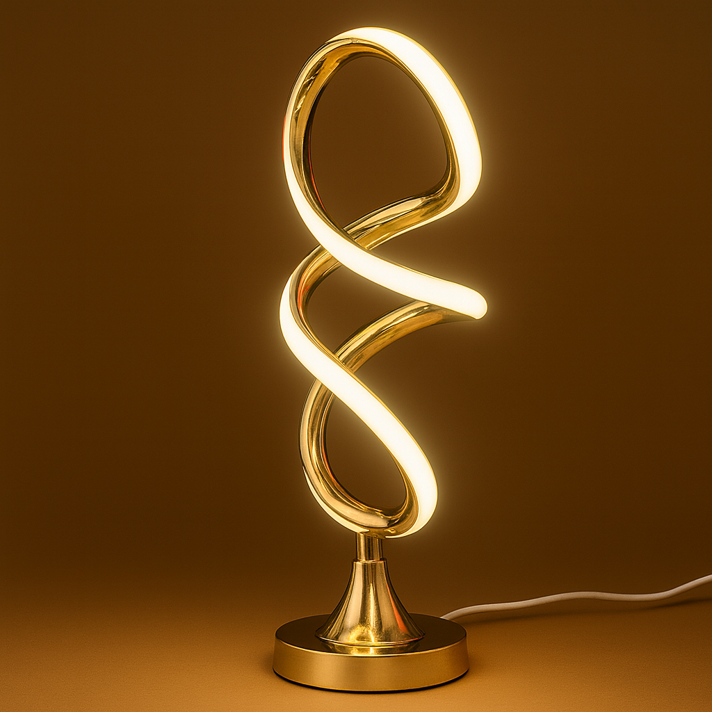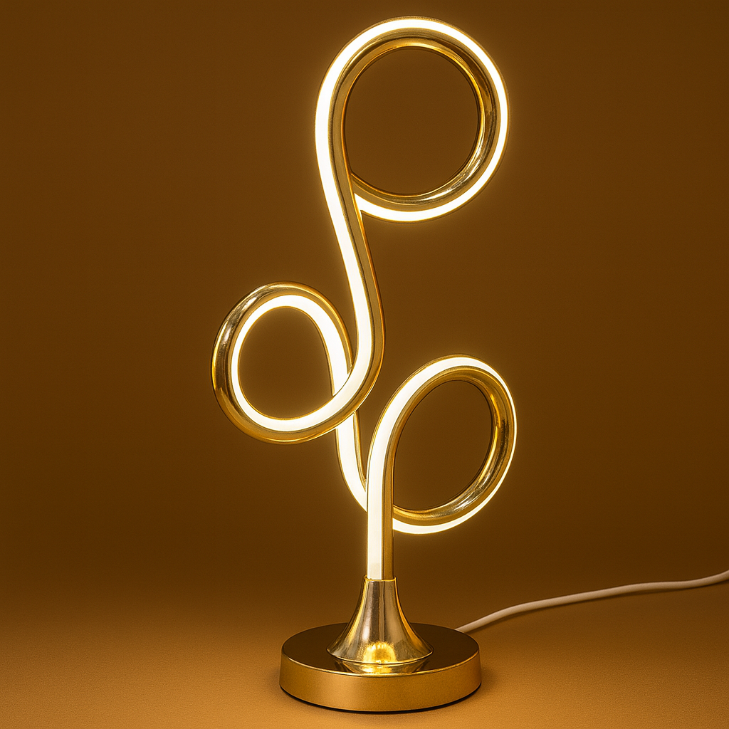 لمبة ديكور مودرن بتصميم متماوج فاخر تضيف لمسة فنية لأي غرفة. تتميز بإطار ذهبي لامع وشريط LED دافئ يلتف بشكل انسيابي ليُظهر جمال الإضاءة بطريقة مبتكرة. قاعدة معدنية ثابتة تضيف أناقة وثبات، ما يجعلها قطعة مثالية لغرف النوم، المكاتب، الصالونات، أو أي مساحة تحتاج جمالاً وإضاءة ناعمة.