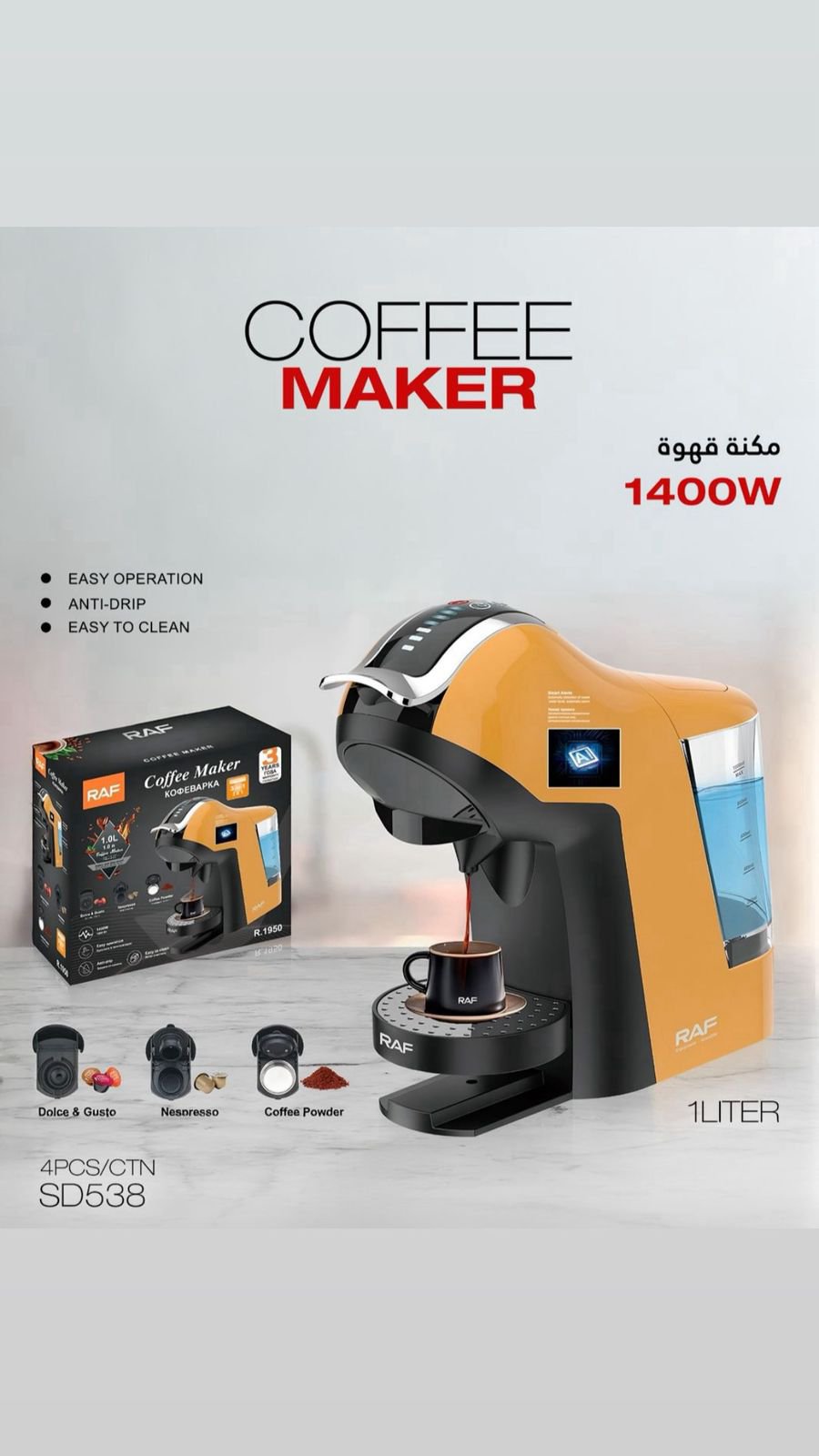 استمتع بتجربة قهوة احترافية في منزلك مع ماكينة القهوة RAF بقوة 1400 واط. تصميم أنيق وعصري، تعمل على 3 أنواع: كبسولات Dolce Gusto، كبسولات Nespresso، وبن مطحون.