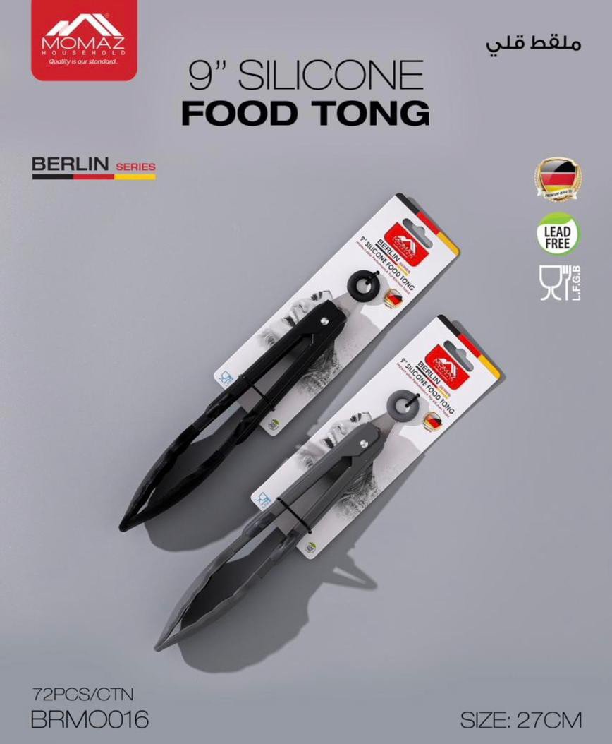 ملقط طعام سيليكون من MOMAZ Household – Berlin Series بطول 9 بوصات (27 سم)، عملي ومثالي للاستخدام اليومي في المطبخ. مصنوع من سيليكون عالي الجودة آمن للاستخدام مع الطعام (LFGB) وخالٍ من الرصاص (Lead Free).