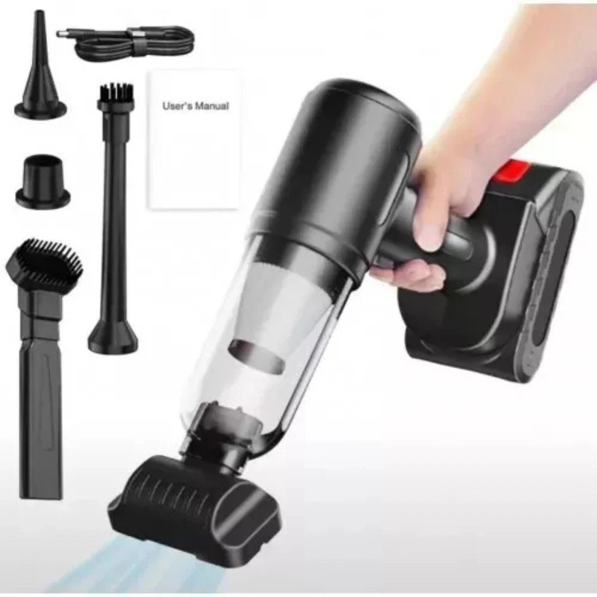 تعمل بالبطارية وقابلة للشحن عن طريق كابل USB، مزودة بعدة فوهات لتنظيف الزوايا الضيقة والأسطح المختلفة.