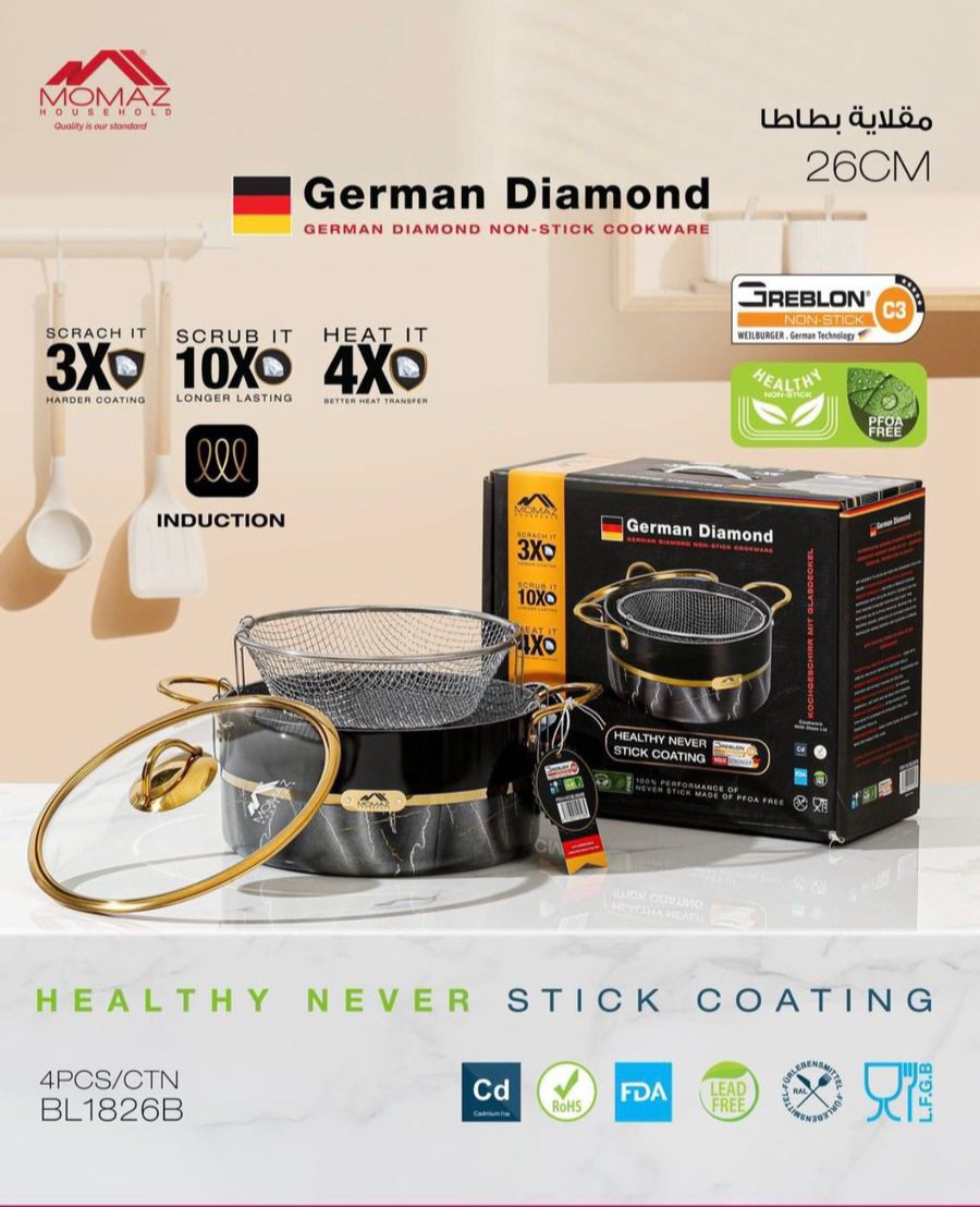 مقلاة بطاطا من *German Diamond* بقطر 26 سم، مصنوعة من الألمنيوم عالي الجودة ومغطاة بطبقة *Treblon C3* الألمانية غير اللاصقة، لتمنحك تجربة قلي صحية وفعالة دون التصاق الطعام.